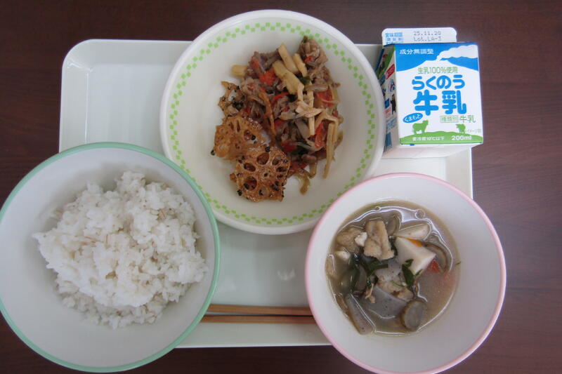11月6日(木) 本日の給食は、麦ご飯、のっぺい汁、かみかみ丼のぐ、れんこんチップ、牛乳でした。