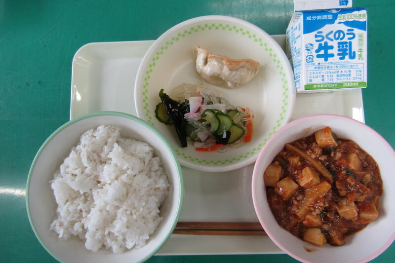 9月18日(木) 本日の給食は、麦ご飯、マーボー豆腐、ぎょうざ、はるさめの酢の物、牛乳でした。