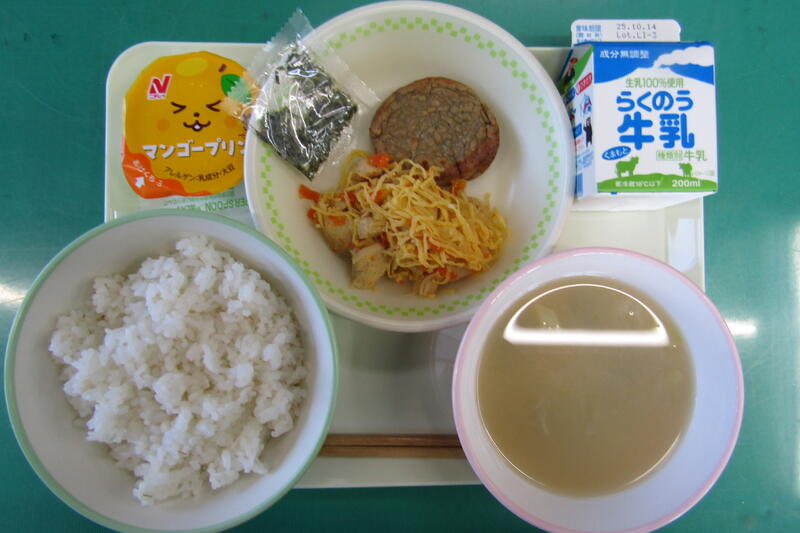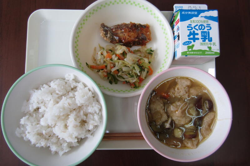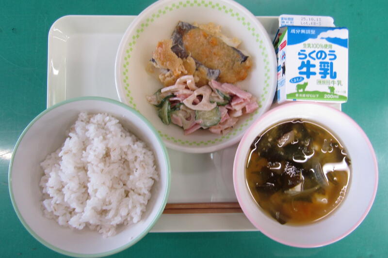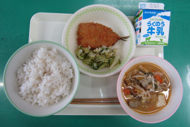 10月3日(金) 本日の給食は、麦ご飯、キムチ豚汁、いわしのフライ、梅肉和え、牛乳でした。