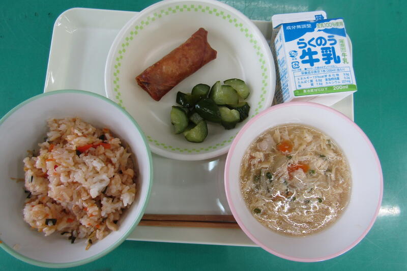 9月25日(木) 本日の給食は、豚キムチごはん、かき玉汁、春巻き、きゅうりのレモン和え、牛乳でした。
