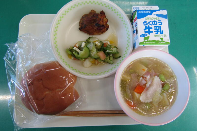 10月1日(水) 本日の給食は、丸パンカット、ラビオリスープ、タンドリーチキン、イタリアンサラダ、牛乳でした。