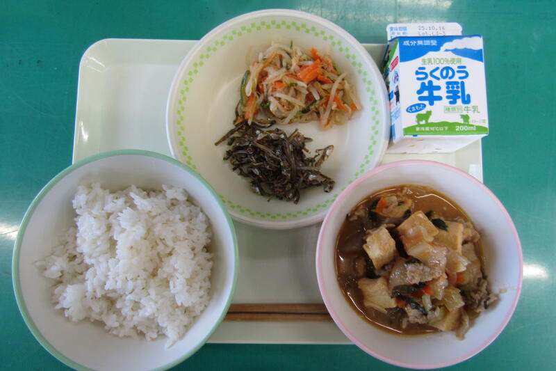 10月2日(木) 本日の給食は、麦ご飯、ジャージャン豆腐、もやしのナムル、マヨいりこ、牛乳でした。