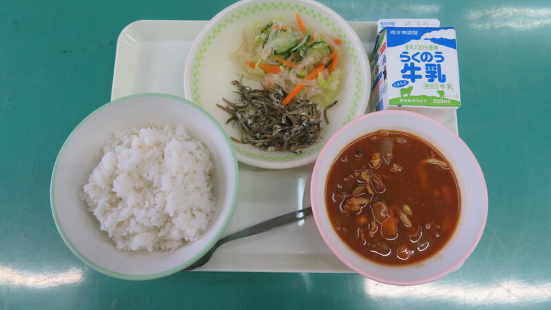 5月9日(金) 本日の給食は、麦ご飯、ハヤシルー、ぷるるんサラダ、マヨいりこ、牛乳でした。