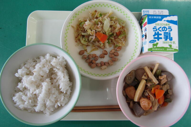 5月15日(木) 本日の給食は、麦ご飯、筑前煮、おかか和え、黒糖大豆、牛乳でした。