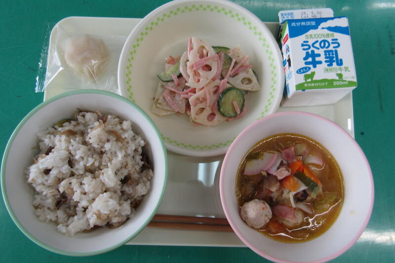 今日は、熊本県の郷土料理等を紹介する「ふるさとくまさんデー」の給食でした。 献立は、馬じゃこご飯、五目スープ、辛子れんこんサラダ、いきなり団子、牛乳でした。