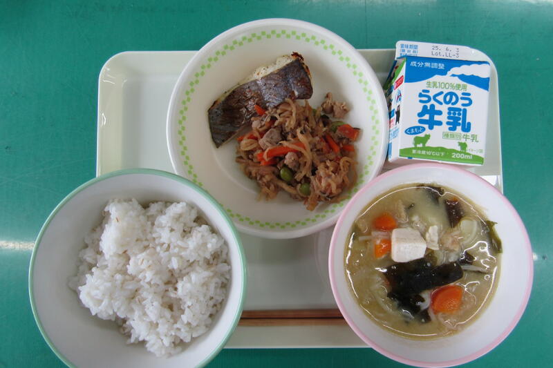 5月20日(火) 本日の給食は、節そうめんのみそ汁、ホキのハーブ焼き、切り干し大根の炒め煮、麦ご飯、牛乳でした。