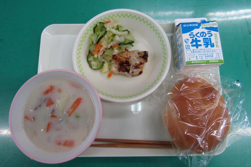 豆乳は大豆からできています。今日のスープは大豆からできた豆乳が材料と思いないほど、クリーミーで食べ応えがあるスープでした。豆乳は、豆腐と同じで筋肉や骨をつくるために必要なタンパク質やビタミンBなどが多く含まれています。成長期の子どもたちにとって必要な栄養素ですね。本日もおいしくいただきました。ありがとうございました。ごちそうさまでした!