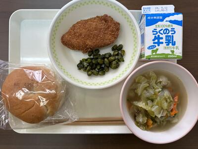 今日のメニューは、チーズパン、キャベツと肉団子のスープ、かつおフライ、お茶豆、牛乳でした。