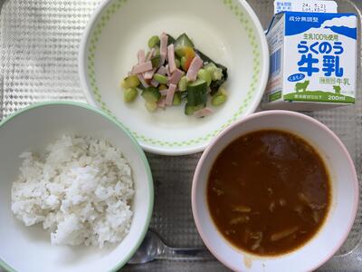 今日のメニューは、ハヤシライス、ナゲット、枝豆サラダ、牛乳でした。