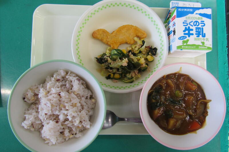 今日が令和7年度の最後の給食でした。子どもたちが大好きな南関町の野菜がたっぷり入ったカレーでした♥ほうれんそうも入っていて、彩りも良かったです。古代ご飯と野菜カレーの組み合わせが、健康的で、味も美味しくて最高でした!6年生と会えるのもあと2日ですので寂しい気分になりますが、おいしい給食を頂いて元気が出ました!!