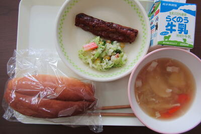 今日のメニューは、コッペパン、ラビオリスープ、スティックドッグ、コールスローサラダ、牛乳でした。