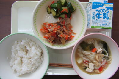 今日のメニューは、わかめご飯、うどん汁、野菜かき揚げ、きゅうりの酢の物、牛乳でした。