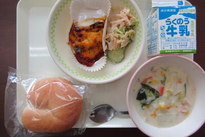 今日のメニューは、米粉パン、白菜のクリームスープ、魚のキャロット焼き、オーロラサラダ、牛乳でした。