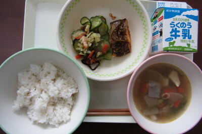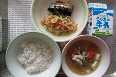 今日のメニューは、麦ご飯、豚汁、さんまおかか煮、切り干し大根の和風和え、牛乳でした。