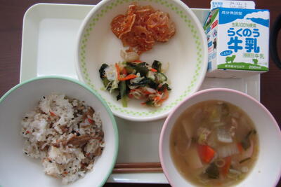 今日のメニューは、梅じゃこご飯、さつま汁、野菜コロッケ、鶏肉とごぼうの中華和え、牛乳でした。