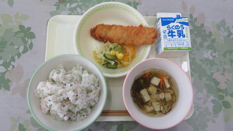 5月2日(金)  本日の給食は、ゆかりごはん、若竹汁、かしわ餅、かつおフライ、はりはり漬け和え、牛乳でした。