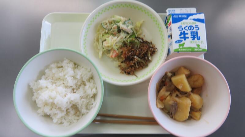 大豆の五目煮には、じゃがいも、こんにゃく、さつまあげ、こんぶ、だいず、とりにく、ごぼう、れんこん、にんじん、しいたけ、きぬさやの11種類の食材が入っていました。ごぼうやれんこん、だいずと歯応えのある食材もあり、しっかり噛んで、和食の良さを味わいました。キャベツの甘酢和えも、キャベツの食感がちょうどよく、ポリポリとおいしくいただきました。たくさんの栄養がとれる給食は、有り難いなあと思いながらいただきました。ありがとうございました。ごちそうさまでした!