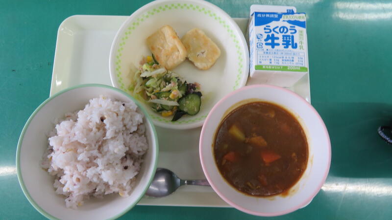 古代米のご飯にポークカレーが合い、おいしくいただきました。今日は、給食後に授業参観でした。元気に発表したり、考えたり頑張っている姿が見られました。給食は、元気の源ですね。本日もおいしかったです。ありがとうございました。ごちそうさまでした!