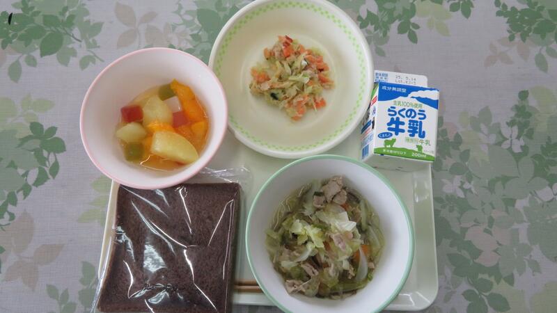 きなこパンは、みんなが大好きなパンです。みんな、笑顔でほおばっていました。ガーリックスパゲッティーは、食欲をそそる味付けでした。さっぱりしたフルーツミックスもおいしかったです。デザート付きで、大満足の給食でした。ありがとうございました。ごちそうさまでした!