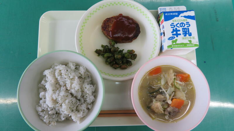 本日の給食は、お茶ご飯、具だくさんみそ汁、ハンバーグ、お茶豆、牛乳でした。