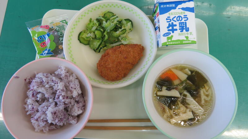 9月2日(火)の給食は、わかめごはん、とうがんのみそ汁、野菜コロッケ、うめおかか和え、牛乳でした。