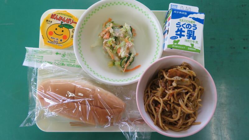 5月7日(水)  今日の給食は、、コッペパン、焼きそば、ツナサラダ、ばんかんゼリー、牛乳でした。