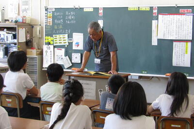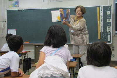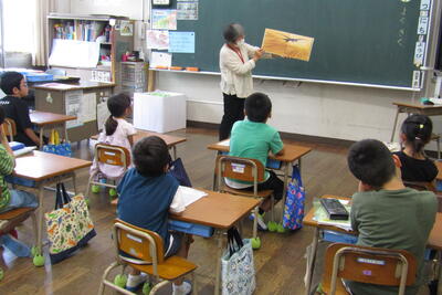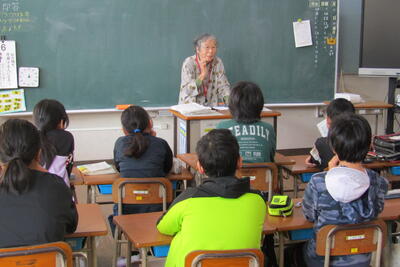 次に、松永欣子さんから、自分が小学生だった頃の戦争体験の話に加えて、対馬丸沈没や広島の建物疎開での被害者に、四小の児童と同世代の子どもたちがたくさんいたことを教えていただきました。
