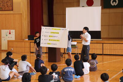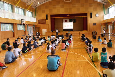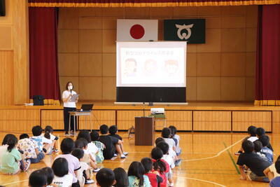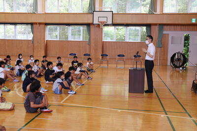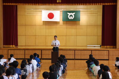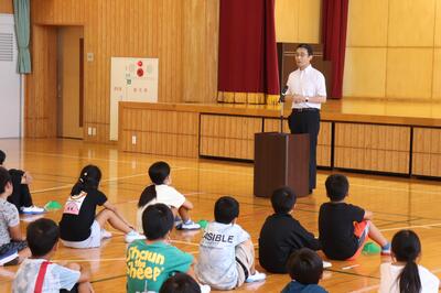 夏休み明け集会では、夏休み中に横断歩道を渡ったあと止まった車に向かって深々とお辞儀した4年生児童の話がありました。町の宝である子どもたちに、学校内外で周りの人を元気に、幸せにする力があることを教えてもらいました。低学年の子も、写真のように、しっかり顔を上げて話を聞いていました。