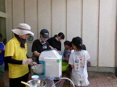 プール後は、かき氷も振る舞われ、子どもたちは重ねて大喜びでした。