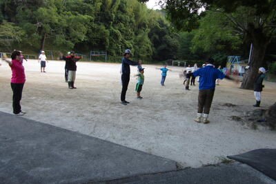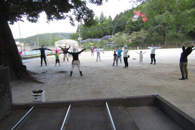 ちょうど、子ども会のソフトボール、ビーチバレーの県大会と重なってしまい、参加者は少なめでしたが、お世話役の日高さんのお声かけで、ラジオ体操第1と第2を頑張りました。