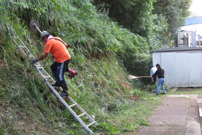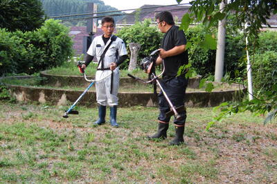 8月18日(日)朝7時前から「みんなでラジオ体操」に引き続き、PTA美化作業がありました。今回も、地域の皆様にもご協力いただき、校地内をきれいにしていただきました。また、永杉教育長もマイ草刈り機持参で駆けつけてくださいました。