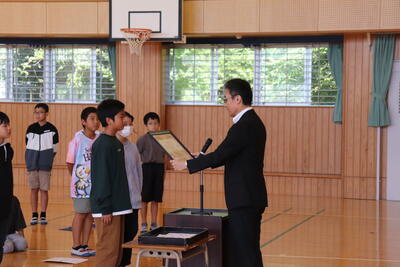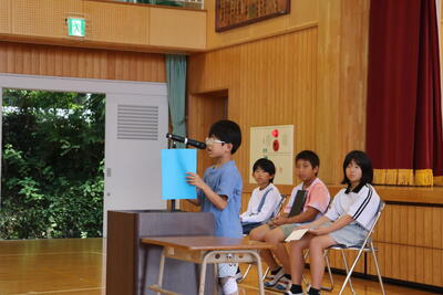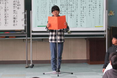 四小からは、5年生の平嶋くんが、標語「ありがとう だれかの心を うごかすよ」を発表し、表彰されました。