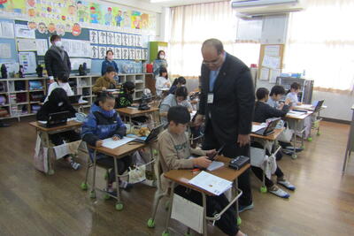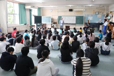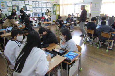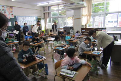 子どもたちが前で発表したり、タブレットを使って思考を深めたり、お互いに意見交流したり、自作教材を通して考えたりする姿を見ていただきました。5年生は、町で取り組んでいる算数専科の授業(他校から先生が教えに来る授業)でした。