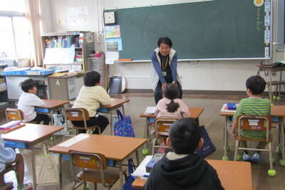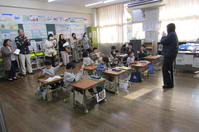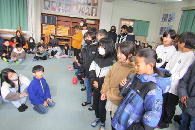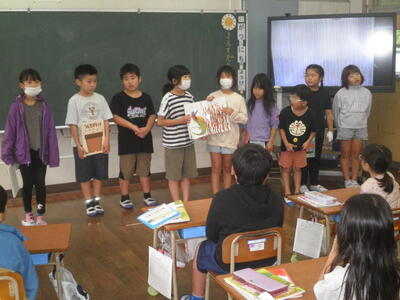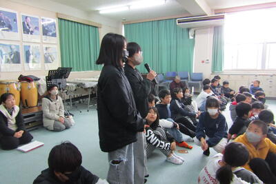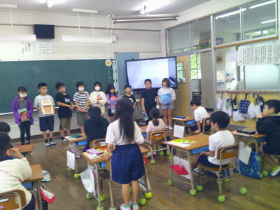 子どもたちは、感想の発言と「青い空は」の歌でお返しとお礼を伝えました。