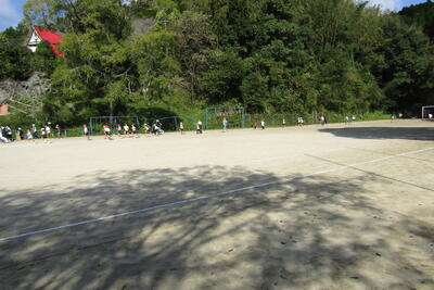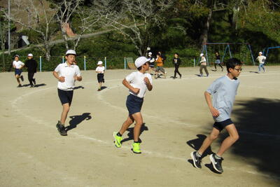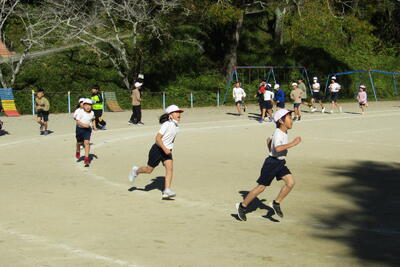 11月6日(水)から、2時間目後の休み時間(業間)に、全校で5分間走を始めました。月末の持久走大会に向けた取組です。