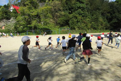 6年生の放送の合図でスタートし、ZARDの「負けないで」の音楽に乗って子どもたちも先生たちもグラウンドを走りました。