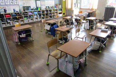 地震発生で机の下に身を隠し、揺れが収まったら運動場に避難する、その際に火事が起きた理科室を回避する、という動きを確認しました。また、先生方は、受持の役割分担と、その動きの確認をしました。