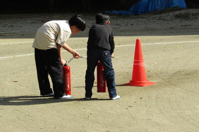 学校はまず第一に、子どもの命を守るところ。職員も、子どもたち自身も、身を守る行動の大切さを学びました。地震では避難路確保のため戸・窓を開放すること、火災では火の勢いを弱めるため戸・窓を閉鎖すること、と消防署の方から教えていただき、とっさの判断を正確にする大切さを知りました。初期消火に用いる消火器の使い方も学びました。