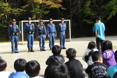 11月18日(月)、南関分署から5人の方に来ていただき、避難訓練をしました。今回は「地震が起こり、その影響で火災が理科室で発生した」という想定でした。