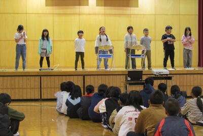 3年生は音楽で学習した「アチャパチャノチャ」「届けようこのゆめを」「ゆかいな木きん」をリコーダー、鍵盤ハーモニカや歌で演奏し、国語で調べた「ことわざ」をクイズで紹介しました。