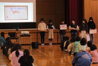 企画委員会は四小人権宣言を紹介してみんなで読み合い、12月のスキルアップに合わせてあいさつや言葉遣いを劇で呼びかけていました。