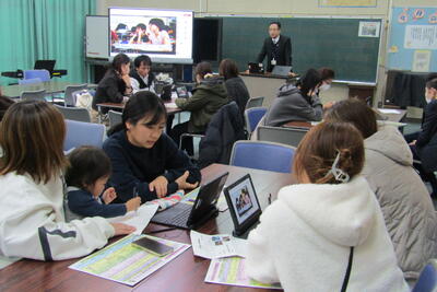 12月5日(木)、授業参観後はPTA講演会でした。今回は、南関町教育委員会から寺田指導主事、さらにICT支援員の髙山さんに来ていただきました。
