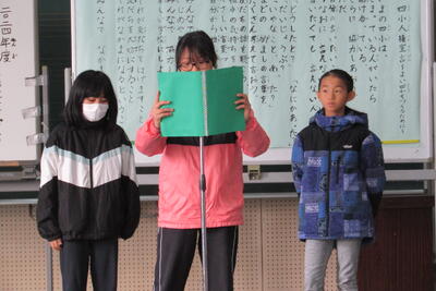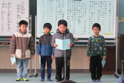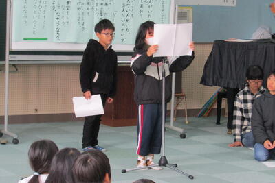 最初に全員で今月の歌「ともだちはいいもんだ」を歌い、企画委員の代表が、今年の四小人権宣言を読み上げました。