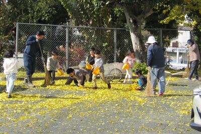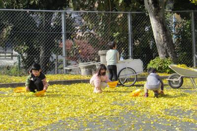 12月16日(月)、外が賑やかだと思ったら、イチョウの落ち葉かきと、イチョウの葉を使って楽しんでいる1年生の姿がありました。