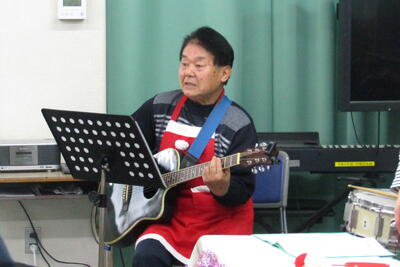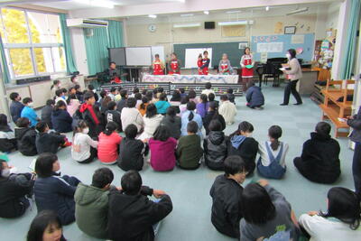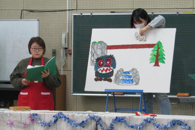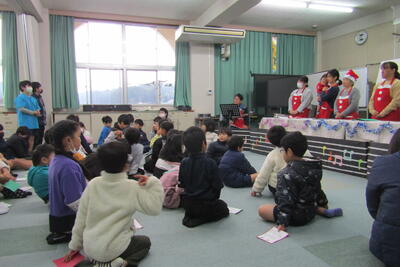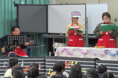 クリスマスに合わせてサンタの衣装でそろえた皆さんが、楽しいお話を届けてくださって、ギターと歌もお話を盛り上げました。準備や練習が大変だったと思いますが、おかげで子どもたちは笑顔いっぱいでした。楽しい時間をありがとうございました。