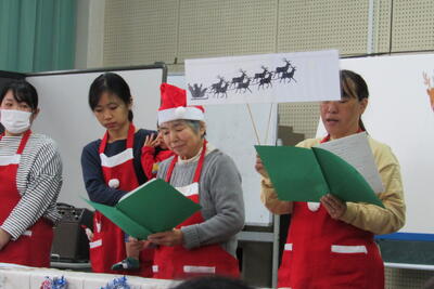 松本さん、前田さん、萩尾さん、関さん、打越さん、沖さん、德満さんによる「3びきのヤギ」のペープサート、「赤鼻のトナカイ」の歌と読み聞かせでした。また、他のメンバーの方も後方から観覧しておられました。