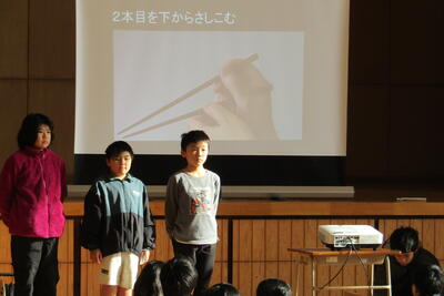 給食委員会は、1月の給食週間にちなんだ豆知識のクイズと、1月の四小スキル(食事のマナー)に合わせた箸の持ち方、使い方の紹介をしてくれました。