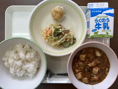今日のメニューは、麦ご飯、マーボー豆腐、にんじんシューマイ、きくらげの中華和え、牛乳でした。