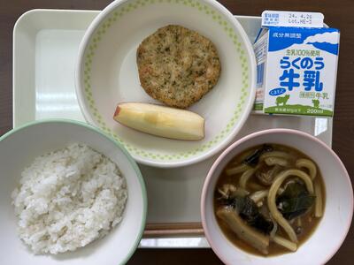 今日のメニューは、麦ご飯、カレーうどん汁、大豆と豆腐のフライ、りんご、牛乳でした。