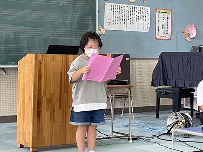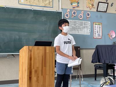 校長から「久しぶりにみんなに会えて、わくわくしています。コロナや大雨で遠くに出かけたり、いろいろな人に会ったりはできなかったかもしれないけれど、オリンピックをテレビで見たり、おうちのお手伝いをしたり、宿題をしたりして、学校生活とは違った心に残る夏をすごしたと思います。9月には運動会、10月には見学旅行や集団宿泊、11月には修学旅行など、運動に学習に充実した秋にしましょう。まだまだコロナのことは心配です。今までよりももっと厳しい対策をして、みんなで心を一つに、『気持ちいいあいさつ、よく聴き、よく話す、まわりを美しく』の四小のめざす子どもの姿に向かって頑張っていきましょう」と話しました。
